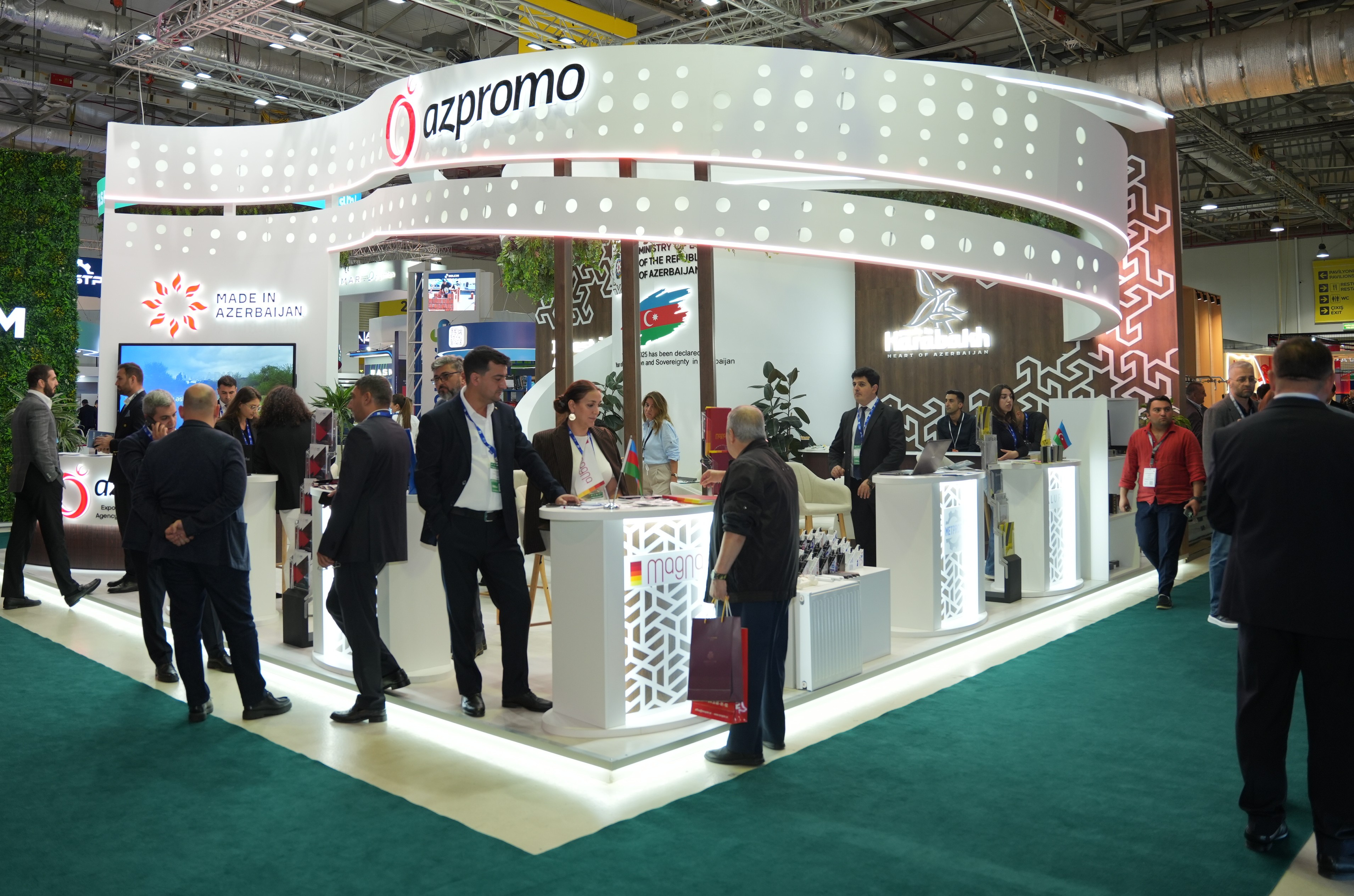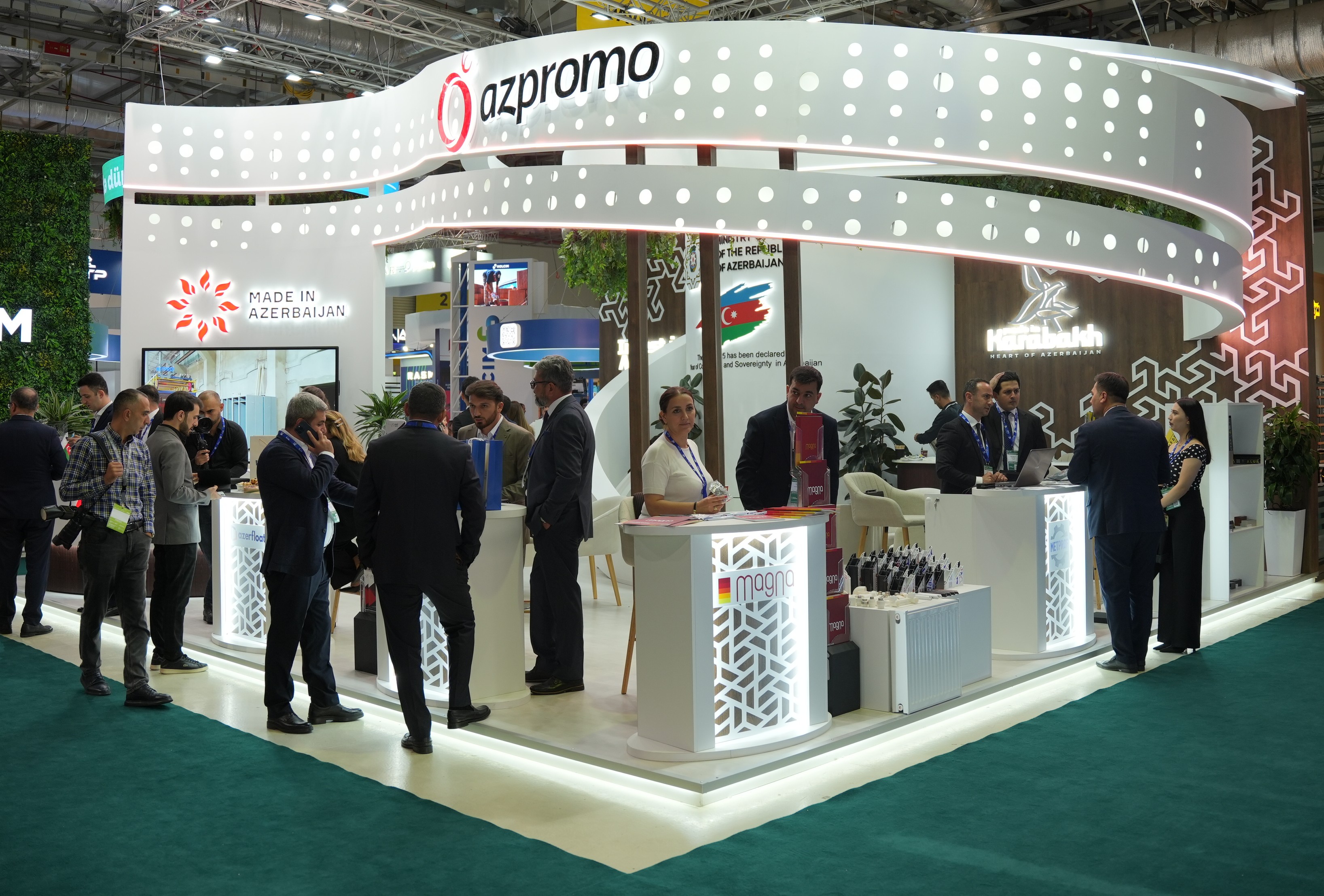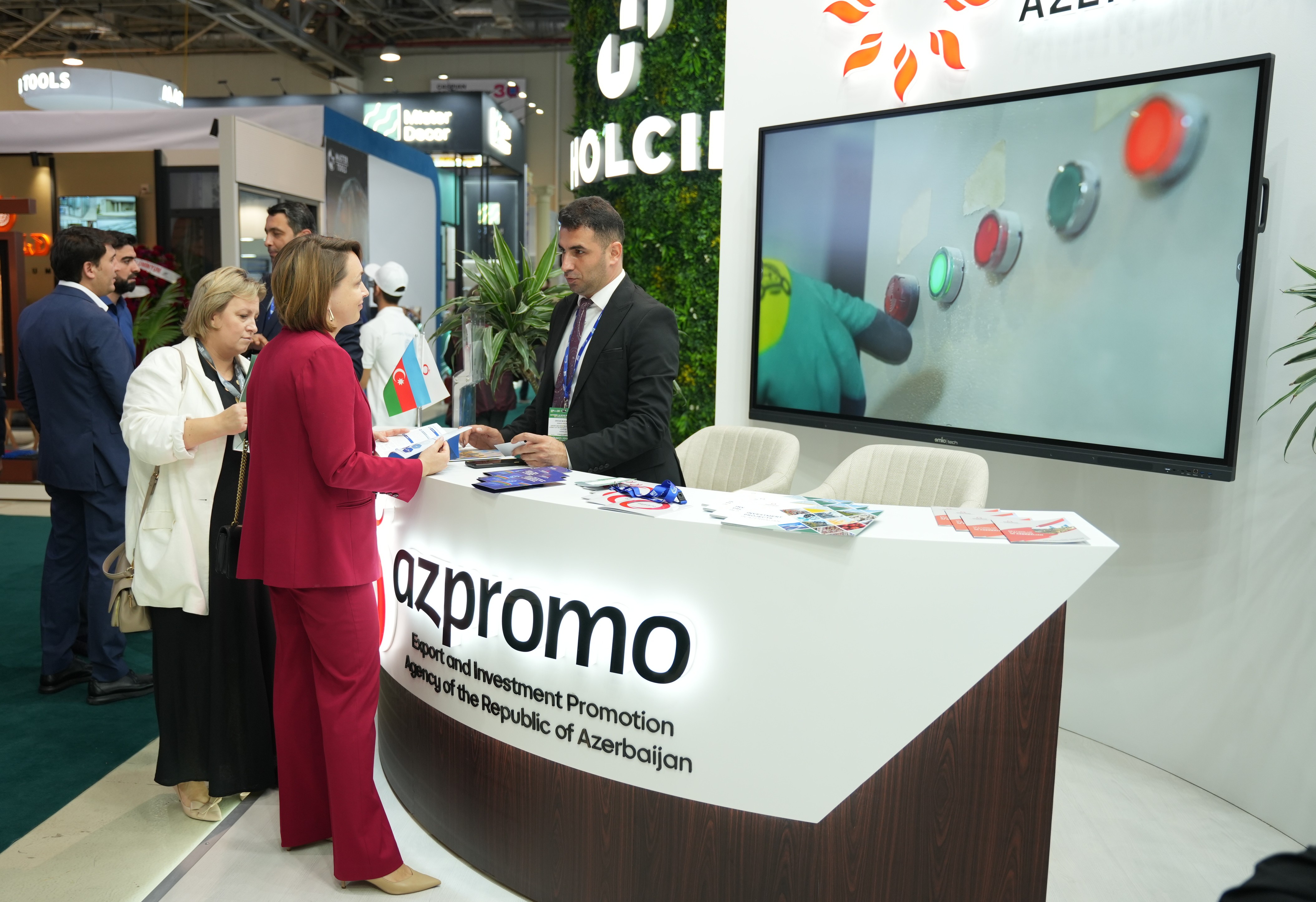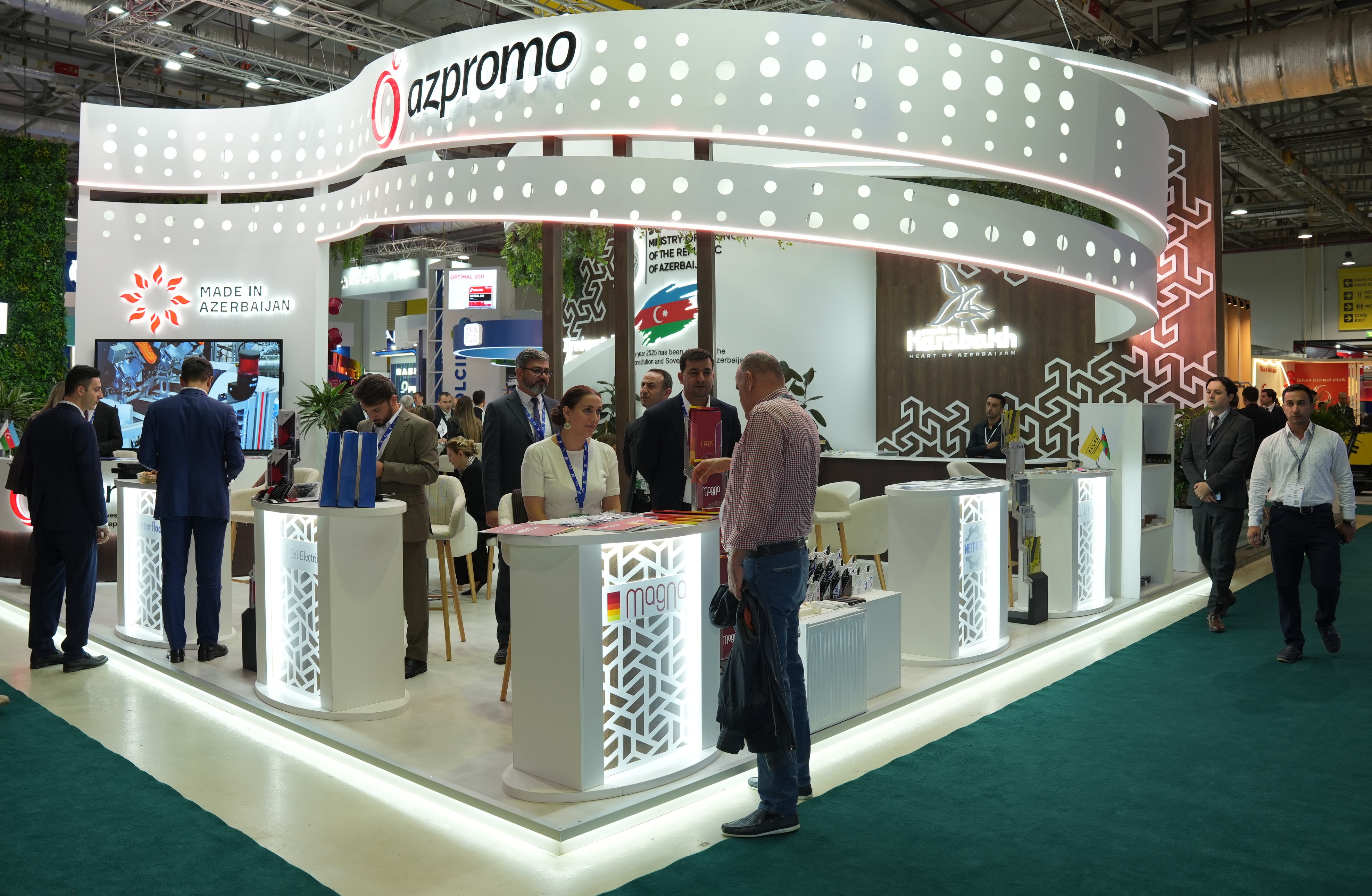 AZPROMO-nun stendində bir sıra yerli şirkətlər öz məhsul və xidmətlərini, o cümlədən tikinti materialları, qoruyucu geyimlər, elektrik avadanlıqları və digər istehsal nümunələrini sərgiləyir. Ziyarətçilərə Azərbaycan şirkətlərinin istehsal potensialını, məhsul keyfiyyətini və ixrac imkanlarını nümayiş etdirən tanıtım videoçarxları və çap materialları təqdim olunur. Stenddə həmçinin işgüzar əlaqələrin qurulması və potensial tərəfdaşlarla danışıqların aparılması üçün xüsusi görüş zonası yaradılıb.